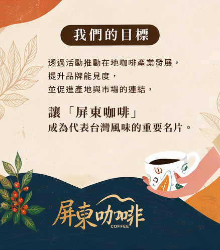 推廣屏東咖啡品牌,並建立農民品質分級觀念,擴大產區效益,辦理屏東精品咖啡豆評鑑,邀集屏東各鄉鎮咖啡產區,共同舉辦評鑑競賽,藉以增進各產區咖啡品質,拓展消費市場,促進咖啡產業之永續發展。